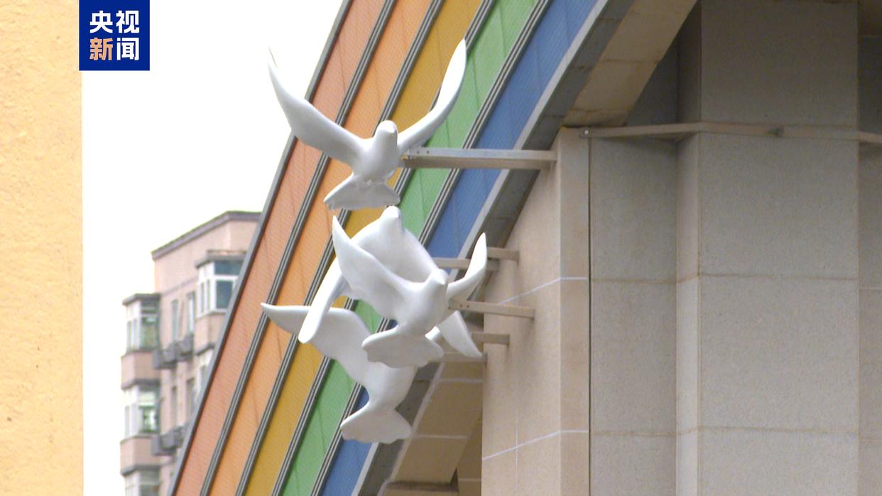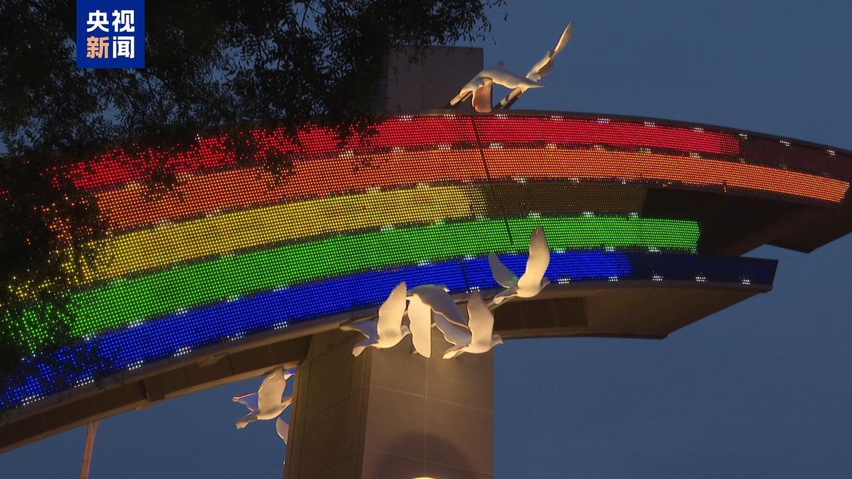 在建國門、復興門兩處彩虹門設置了紀念主題景觀。14只鴿子翱翔彩虹穹頂,象征光明前景,立柱布置紀念活動標識,彰顯儀式的莊嚴莊重,夜間彩虹門光影沿長安街貫通,展現從和平走向復興的民族征程。