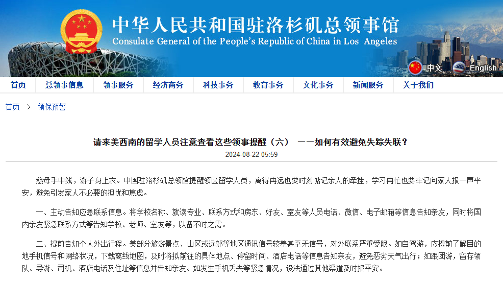 駐紐約總領事館提醒在美留學生避免失蹤失聯