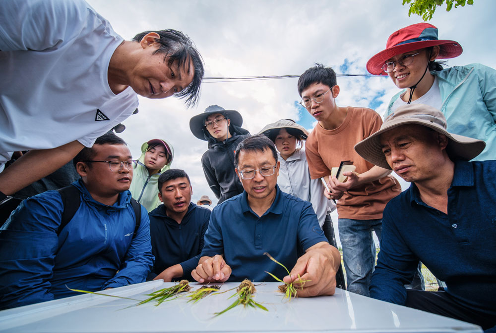 張福鎖(中)與團隊查看洱海水稻試驗田苗情